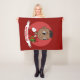 Throw blanket with an illustration of a cute smiling happy black baby girl or boy, the baby is wearing red and white clothes and holding a present; with editable text template for your name or message, Christmas holidays design with a red background