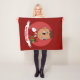 Throw blanket with an illustration of a cute smiling happy baby girl or boy, the baby is wearing red and white clothes and holding a present; with editable text template for your name or message, Christmas holidays design with a red background
