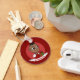 Keychain with an illustration of a cute smiling happy baby girl or boy, the baby is wearing red and white clothes and holding a present; with editable text template for your name or message, Christmas holidays design with a red background