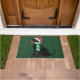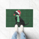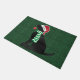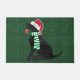 Personalised Festive Christmas Black Lab Holiday Dog dressed in santa hat and green and white scarf holding red polka dot christmas ornament in its mouth. Green Burlap Background. Cute christmas doormat for black lab lovers ! © EMR Designs.
