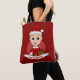 Tote bag with an illustration of a cute smiling happy blonde-haired boy, he is wearing red and white Santa Claus costume and holding a present; with editable text template for your name or message, Christmas holidays design with a red background