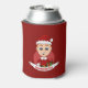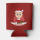 Can cooler with an illustration of a cute smiling caucasian boy with short ginger hair, the boy is wearing a Santa Claus costume with a red hat and holding a present; in a red circle on a red background, a Christmas holidays cartoon design with an editable text template for your name or message