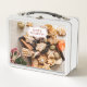 This is a standard metal lunchbox that appears to work just fine. We designed this box ourselves with an uploaded photo and custom text on the front and back. It looks absolutely beautiful except the front of the lunchbox is not centered like it shows in the photo. The print borders don't align with the inset flat part of the box where the preview photo online showed it perfectly centered in there. The back looks nice and centered though.