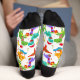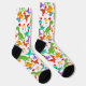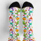 A fun colourful cartoon dinosaur pattern for socks featuring numerous colourful cartoon dinosaurs such as T rex - Tyrannosaurus Rex, Pterodactyl and Triceratops wearing santa hats and carrying gifts . A fun non boring sock gift to buy for those who love dinosaurs. Happy holidays.