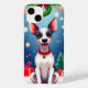Cheerful dog sitting in a festive setting. The dog has a playful expression, with large, bright eyes and a wide smile. Its fur is mostly white with black and brown patches. It wears a red collar adorned with a gold tag. Above the dog, there is a decorative wreath with a red bow, adding to the holiday theme. In the background, colourful bokeh lights and green Christmas trees create a joyful atmosphere, while wrapped gifts are visible, enhancing the festive spirit.