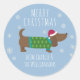 This cute round Christmas sticker features a funny cute daschund with snowflakes on a light blue background. Personalise with your pet's name and your family name