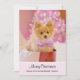 A flat Christmas holiday card personalised with your name and message on the back. Designed with an adorable Christmas dog wearing a cute pink plaid bow tie. This tiny little pet is sitting inside a whimsical hat box. A white tree decorated with pink lights in the background. The lights are blurred giving it a magical bokeh effect. Darling Christmas themed photograph, perfect for animal lovers and pet owners.