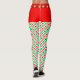 Green and red Christmas Elf dotted diagonal striped leggings. The red upper part has golden clovers.
