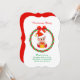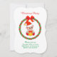 Cute Christmas elf dressed in red Christmas party invitation. Cute baby elf holding a gift box at the centre of a green and red wreath. Text is ready to be personalised.