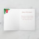 Cute Christmas elf, pine wreath, poinsettias and golden stars on red Christmas Greeting card. Text ready to be personalised.