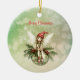 A cute fairy wearing a red cap sits on a green Christmas ornament decorated with holly leaves and berries while snowflakes swirl around her. The words “Merry Christmas” can easily be changed to any greeting you prefer and the back can be personalised as well.