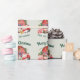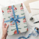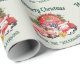 This custom Christmas holiday wrapping paper features a cute watercolor cartoon illustration of a farm. Little baby farm animals are dressed in Santa hats outside of a country farmhouse. The background is a light sage green colour.