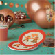 This awesome set of paper party plates features a graphic image of a cute gingerbread couple. The gingerbread man has green and red buttons and green and red fringed trousers. The gingerbread lady has pretty eyelashes and wears red lipstick. She has a green and red fringed skirt and top on. Both have a big smile. There is a gingerbread heart above the couple showing their love for each other. There is white writing inside the heart that says "made for eachother". This would make a lovely gift for a couple at Christmas.