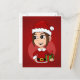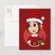 A postcard with an illustration of a cute smiling girl with brown hair, the girl is wearing a Santa Claus costume with a red hat and holding a present. On a red background. With a customisable text template for your name or message.