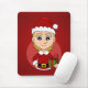 A mousepad with an illustration of a cute smiling caucasian girl with short blonde hair, the girl is wearing a Santa Claus costume with a red hat and holding a present; in a red circle on a red background, with an editable text template for your name or message