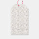 A Christmas gift tag features a cute gnome standing on a bed of pine needles in front of his cosy home. A glittery gold star is atop his tree. Below in festive red retro-style calligraphy is "Merry Christmas" and below is preprinted "to" and "from" text. The reverse is a pattern of tiny gold stars. (The glittery gold details are digital print only).
