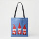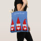 Three Christmas Gnomes and snowflakes on sky blue Tote Bag. Text can be personalised.