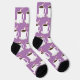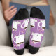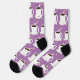 Christmas socks with a pattern that features a smiling mug of hot cocoa with a candy cane and several cheerful marshmallows on a lavender purple background. Add a pair or two to your cart, get them home, then enjoy them on your feet!