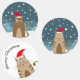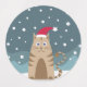 Santa claus kitten between snowflakes. Cute cartoon pet cat in christmas landscape. Meowy Christmas funny kitty