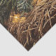 Postcard featuring a digital oil painting of a cute lamb surrounded by pine cones and pine tree garland with Christmas lights. The wood background adds a rustic vibe to the artwork.