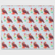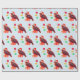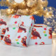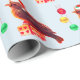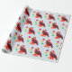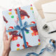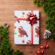 Cute Christmas little bird standing on a gift box near Christmas balls on light blue background wrapping paper.