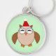 This cute keychain features a funny cartoon of a Christmas owl with sleepy eyes, a small orange beak and cute little orange feet. The owl is brown with a cream belly and is wearing a red and white Santa hat ready for Christmas.