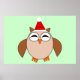 This poster features a funny cartoon of a Christmas owl with sleepy eyes, a small orange beak and cute little orange feet. The owl is brown with a cream belly and is wearing a red and white Santa hat ready for Christmas.