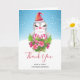 Thank you card with a cute and whimisical design featuring an adorable penguin wearing a red santa hat. Standing behind a bouquet of flowers with pink and white striped candy canes. A snowy winter background with snowflakes falling.