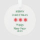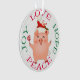 This cute Christmas ornament features an image of a little dancing pink pig dressed in a red and white Santa hat. A little bird perches on the hat, and the pig holds a peppermint candy swirl. The text in red and green around the edge says "Love Hope Peace Joy". The back of the ornament has three custom text fields in green and red, and red snowflakes as a divider. Sure to bring a smile!