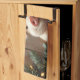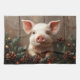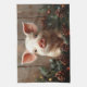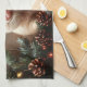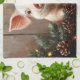 Kitchen towel featuring a digital oil painting of a cute pig surrounded by pine cones and pine tree garland with Christmas lights. The wood background adds a rustic vibe to the artwork.