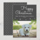 Cute Christmas Pine Branches Snowflake Dog Photo Card. Cute Christmas dog photo card with Christmas tree branches. The background is dark grey with white snowflakes and the text is in trendy white script. Add your photo and customise the message on the front.