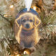 Cute puppy dog outside on as it snows illuminated snowflakes personalised Christmas ornaments.