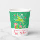 Personalise these festive Christmas paper cups with your own name. Fun Christmas green, bright red and white design of a reindeer with a red nose prancing over boxed Christmas gifts. Ideal for easy Christmas parties with family, friends or clients. © Original art and graphic design by Sarah Trett for www.mylittleeden.com on Zazzle.