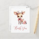 Thank you postcard with an illustration of an adorable baby deer. Big eyes big ears with a large head and little brown antlers. Wearing a big red bow. Standing beside a stack of gifts.