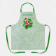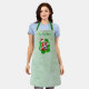 This kitchen apron is a textured look light green with a cute Christmas skeleton holding red and green ornaments up to his eyes wearing a Santa hat inside a vibrant green and red splatter shape. Customise your text with the template.