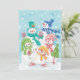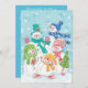 Vintage illustration Merry Christmas holiday design featuring an adorable cartoon happy snowman family with mum, dad and the snow children. Everyone is smiling and wearing a scarf and holding Christmas presents and a Christmas tree. It is snowing with large snowflakes falling. Their scarves and hats are all different colours, red, yellow, green and blues.