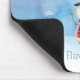 Personalised mousepad with a cute snowman illustration. He is wearing a black stovepipe hat, holding a classic corn cob pipe, and wearing a red scarf. Standing in the cold white snow smiling and waving hello. The background is composed of a watercolor sky with blue and purple colours blending and mingling together.