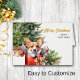 On this Holiday card, a cute Corgi dog pops out of a red Christmas gift box. Behind him is a decorated Holiday tree. The gold script text at the right says "MERRY CHRISTMAS", with HAPPY NEW YEAR in green below it. All the text, inside and out, may be easily changed to anything you'd like. You can see more dog images and products at Dog Village.
