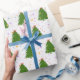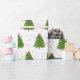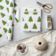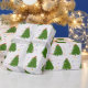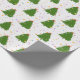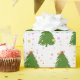 A cheerful pattern of Christmas trees with red bows and colorful pastel dots on a light grid background.