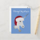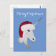 Send a friend or family member who loves unicorns this adorable holiday postcard. The front is designed with a big pretty white unicorn and she has long black eyelashes and is wearing a red Santa Claus hat. "Merry Christmas" is at the top of card in white script lettering. Customisable blue background. The back of card has a Christmas greeting and you can customise to anything you wish.