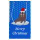 This awesome gift bag features a graphic image of a cute little Christmas Walrus. The Walrus has brown fur with big black eyes and white tusks. It is sitting on an iceberg in the middle of the ocean and wearing a red and white festive hat. The walrus is surrounded by pretty octagonal blue snowflakes falling down all around it.