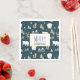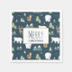 Paper napkins with a whimsical festive pattern. Polar bears, reindeers, trees. foxes, and snowflakes. On a dark green background. Merry Christmas written inside a rectangle frame with a faux gold foil border.