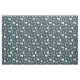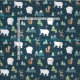 Fabric with a whimsical festive pattern. Polar bears, reindeers, trees. foxes, and snowflakes. On a dark green background.