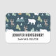 Name tag with a whimsical festive pattern. Polar bears, reindeers, trees. foxes, and snowflakes. On a dark green background.