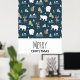 A poster with a whimsical festive pattern. Polar bears, reindeers, trees. foxes, and snowflakes. On a dark green background.