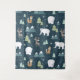 Tapestry with a whimsical festive pattern. Polar bears, reindeers, trees. foxes, and snowflakes. On a dark green background.