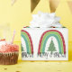 Sweet “Merry & Bright” typography holiday rainbows made up of Christmas trees and holiday colours rainbow. Christmas lights and festive seasonal colours of red and green.