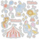 Cute happy circus theme with tent, horse, lion, tiger, elephant, balloons and stars in soft colours