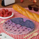 Very cute hand-drawn illustration: purple clouds and red hearts rain. Perfect for funny art lovers.