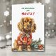 On the front of this Christmas card, an adorable blonde Cocker Spaniel dog wears his Holiday attire and sits beside a pine bough and decorations. He looks at us with surprise and expectation. The text at the top says "Did someone say SANTA?" The message inside can be easily customized to anything you'd like, or left as is. Cute!
